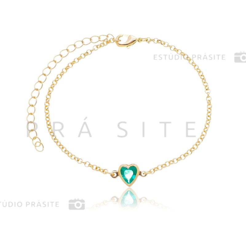 Pulseira elo portuguesa com coração em cristal turmalina em banho de ouro 18k
